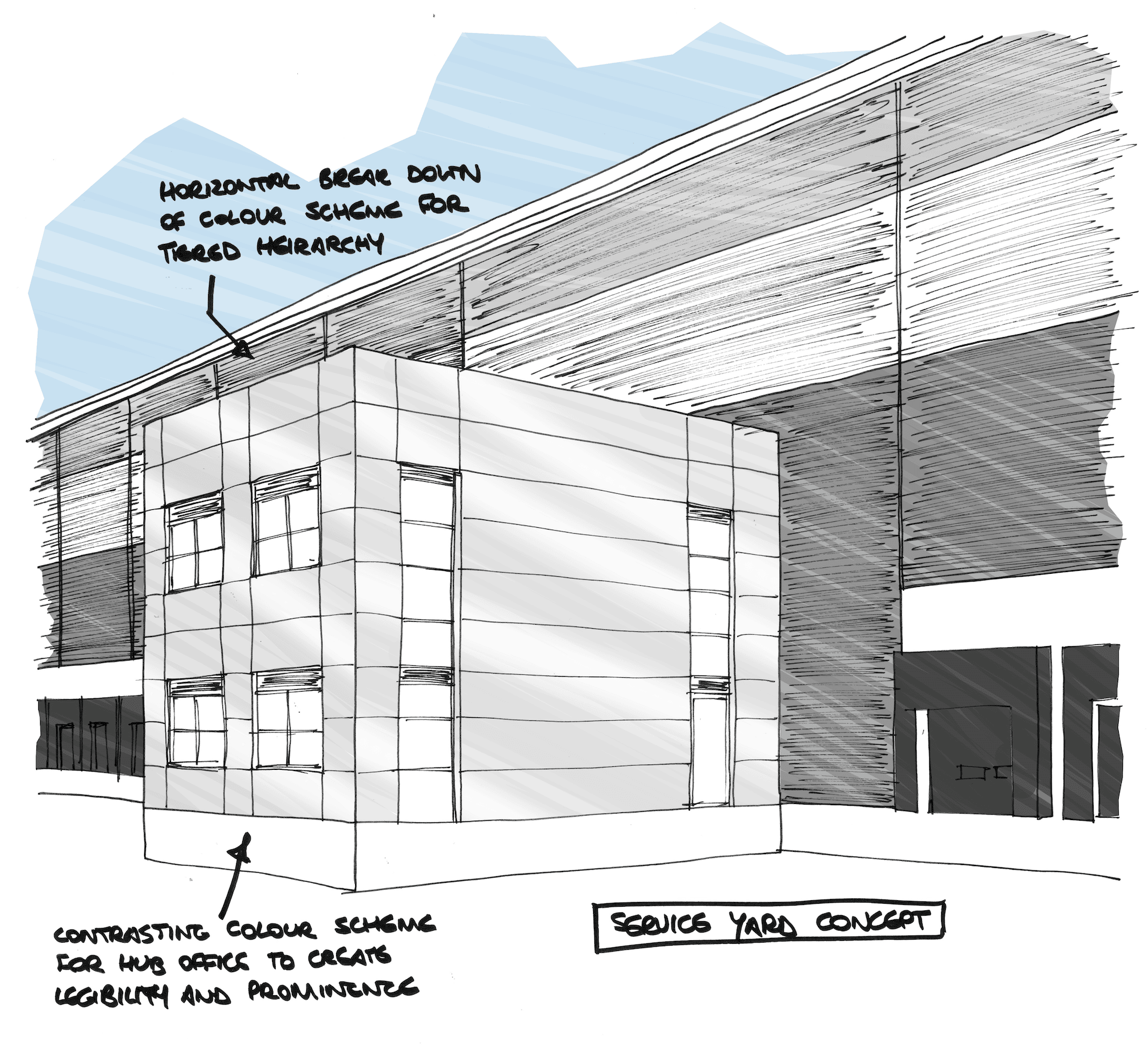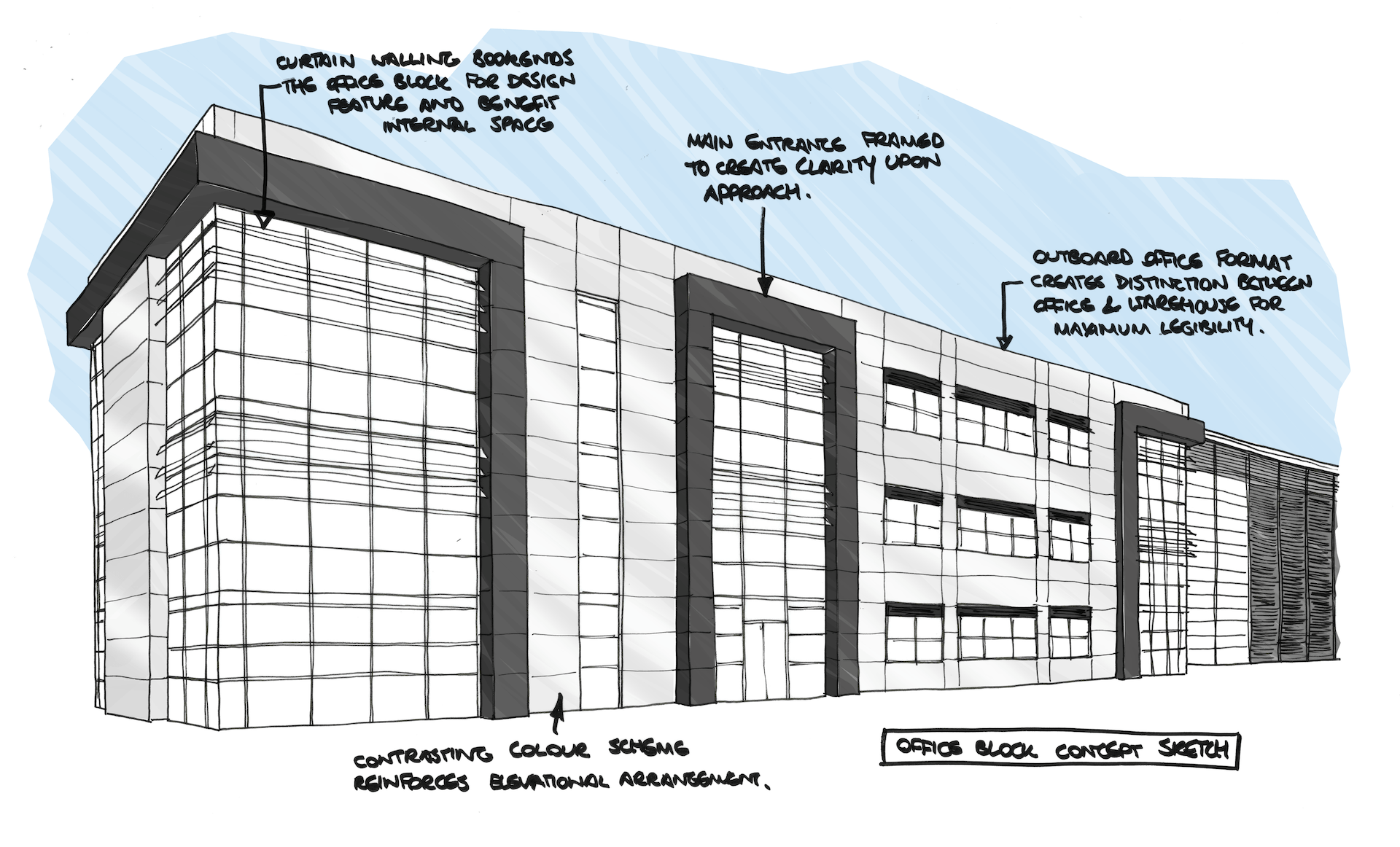 The format of the building has naturally been dictated by the shape of the site, working around pinch points. As a result, an outboard office format was explored that more efficiently used the space available, while creating a key design feature and building frontage. Colour contrast is used to enhance the visibility along the warehouse elevation.
