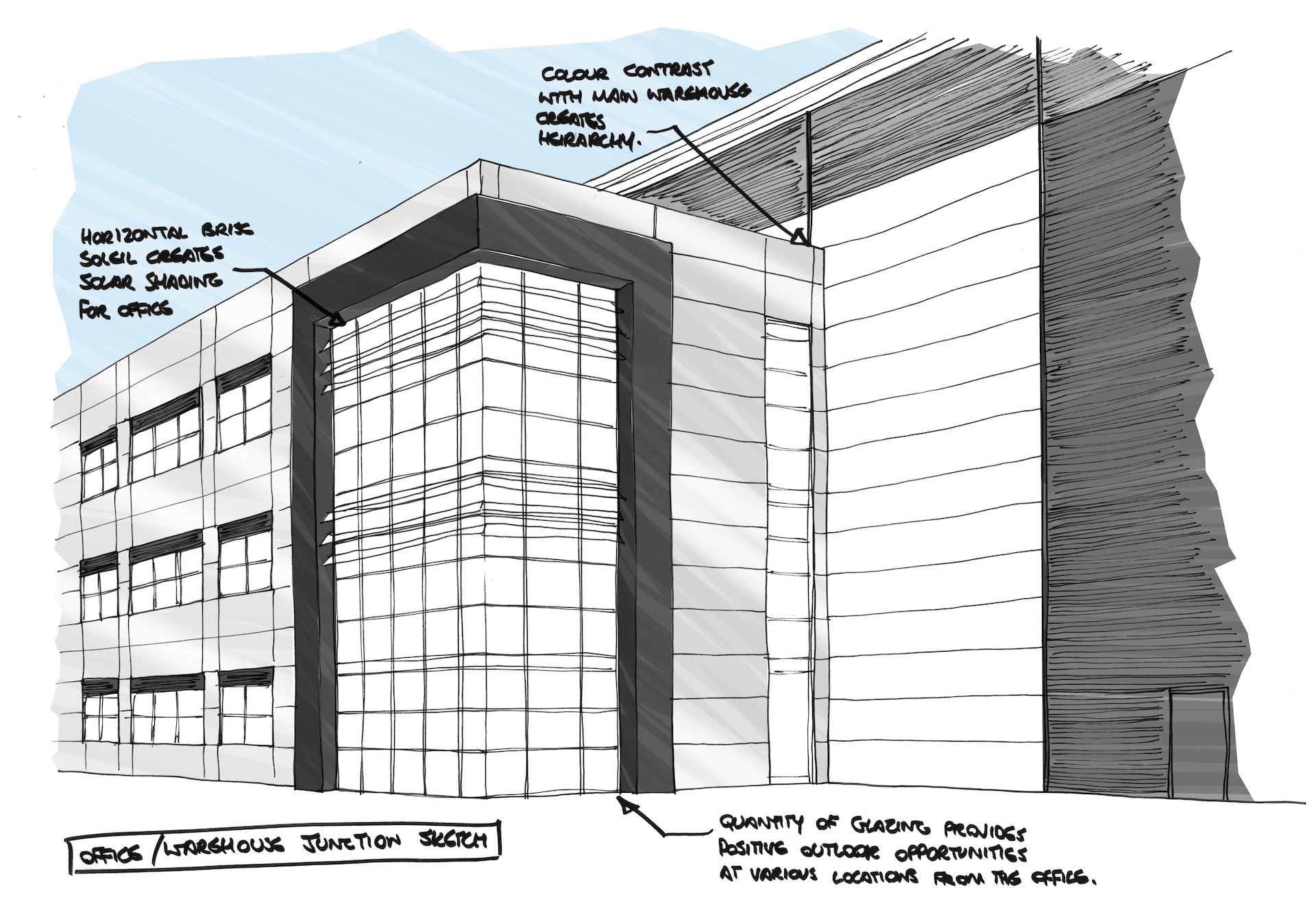 The priorities for the warehouse design is a breakdown of the mass of the building. Industrial buildings typically consist of large expanses of singular materials and can contribute to blandness. Specific choices were assessed to break up the main elevations through materiality and texture, providing visual relief and interest through a robust architectural approach.