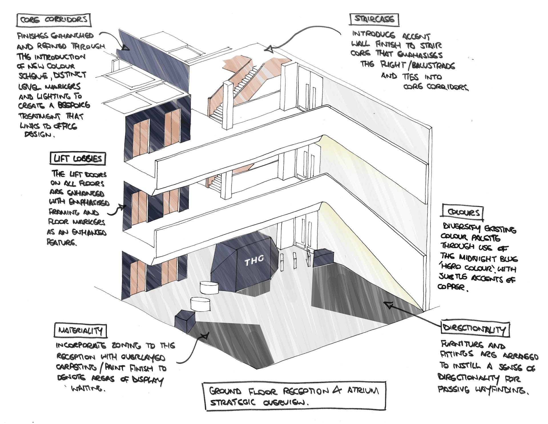 The circulation spaces were the core of the building primarily housing the lifts, toilets and feature stair. This was a high traffic area and as such the finishes must be robust, but they must reflect the THG Branding.