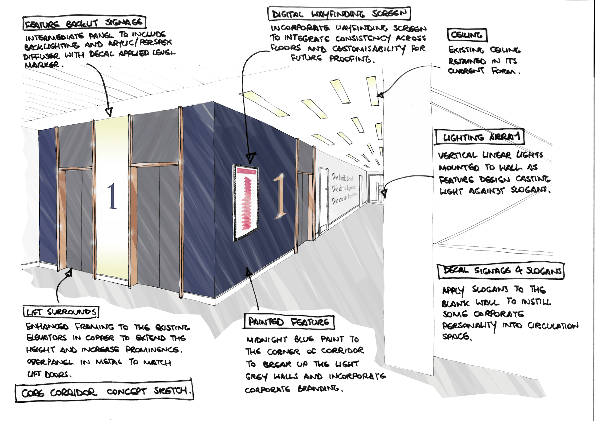 We particularly looked to Enhance the existing lift elevations with a copper surround which extended the height and increase prominence. A Over panel in metal to match lift doors was also included.