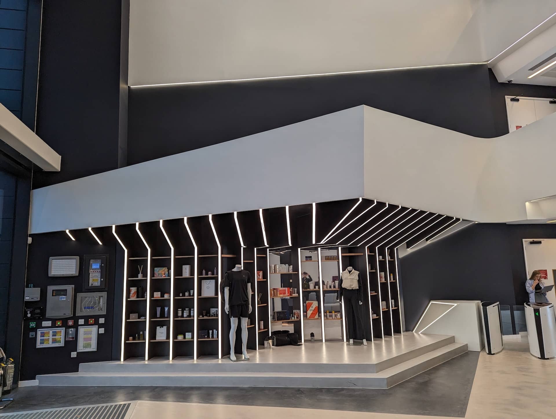 The Product Display Area was treated with a more freeform design, using the existing metal wall features as the instigator for a projecting product display defined by linear feature lights and a contrasting backdrop which provides the framework for arranging the products.