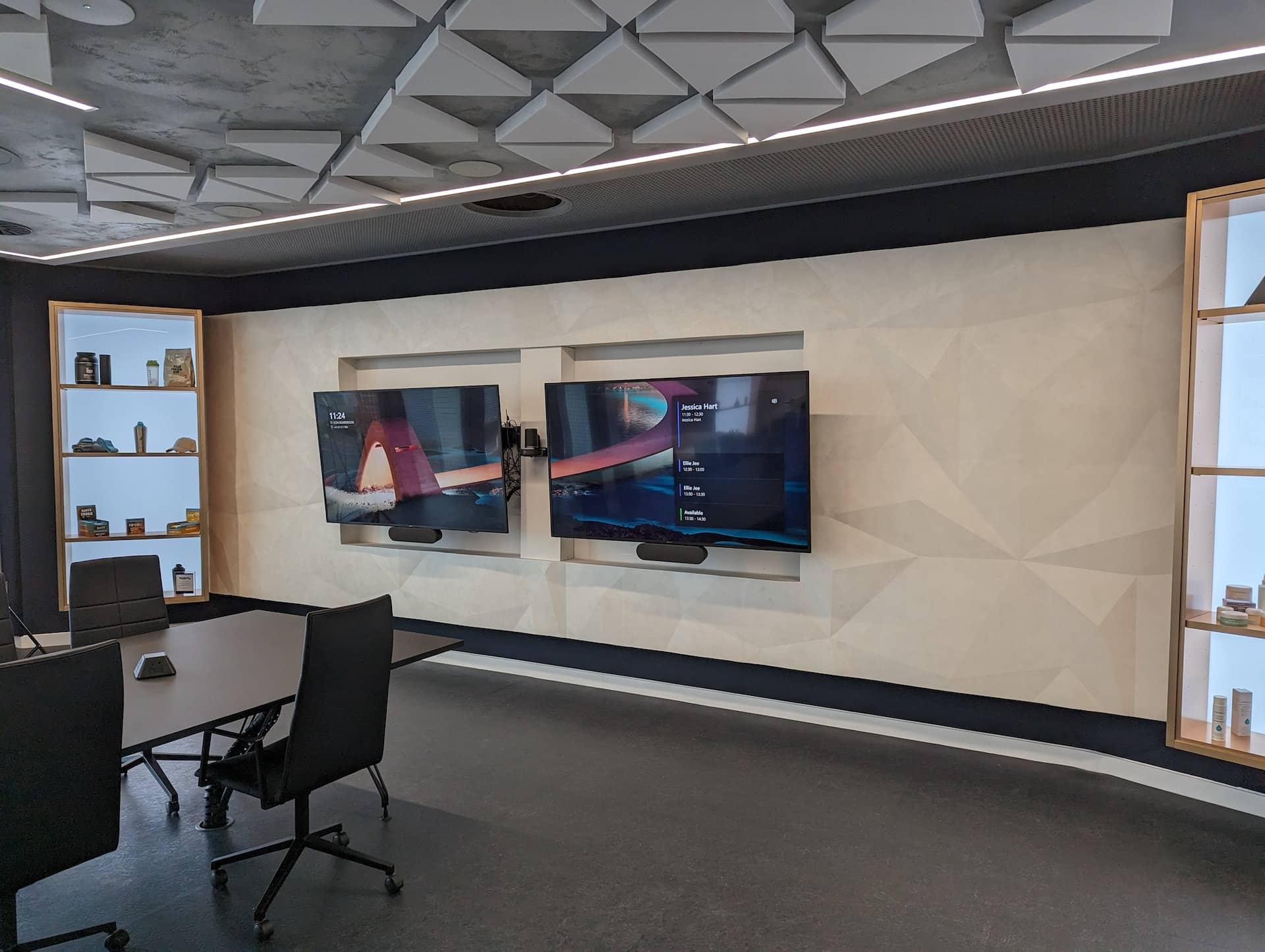 The boardroom included a feature wall treatment, the Armourcoat panel was supplemented by two backlit shelving units that match the finish of the Awards Walls. This helped to frame the feature panels while providing the opportunity to customise the display in the future.
