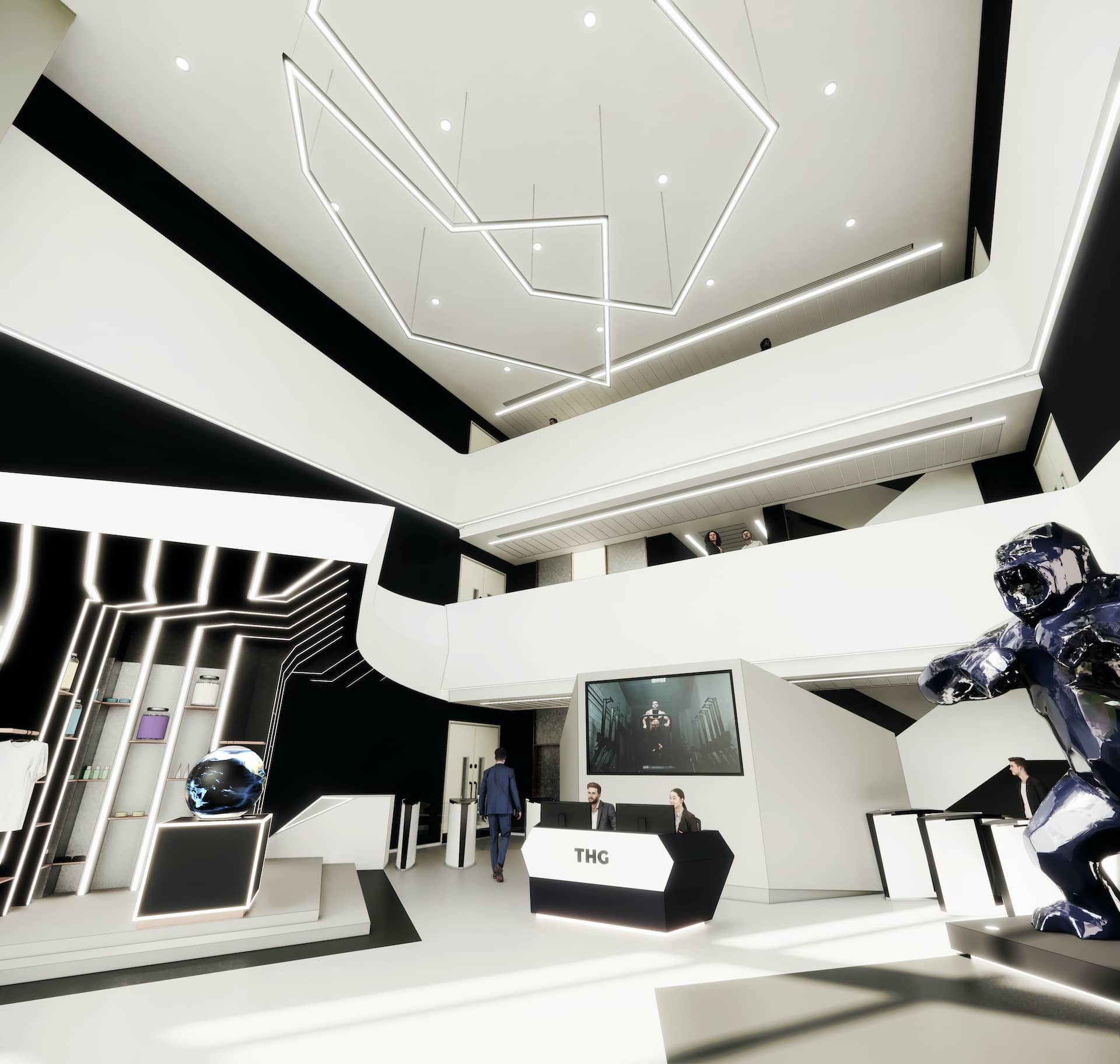 After completing the THG Offices & Studio Base build project in early 2020, the THG buildings went on to receive a futuristic fit out. In 2022 we were approached by THG to enhance the fit out in specific areas giving these areas a unique feel in line with THG Branding but also reflecting the Dominance of the THG Brand.